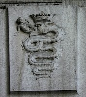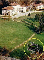 Esquerda: O biscione ("cobra grande") como símbolo de Milão, aqui visto na estação férrea central de Milão. Ao lado: O logotipo da Alfa Romeo. Direita: Mansão do primeiro ministro italiano, Silvio Berlusconi.