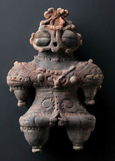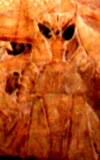 Esquerda: Estatueta que lembram uma lagartixa ou uma serpente produzidas entre 4.000 e 5.000 a.C. encontradas nas ruínas das cidades de Ur e Eridu na Mesopotâmia. Centro: Mural, na tumba do filósofo egípcio Ptah-Hetep, no qual a criatura alien é estampada. e a última: Dogū são estatuetas japonesas que marcam o período Jomon Jidai, 14,000 a.C. a 400 a.C..